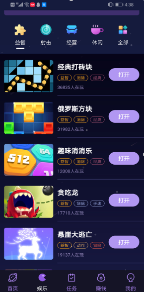 玩游戏赚钱既可以在“娱乐”中玩小程序游戏赚钱,还能在“赚钱”中玩手游和棋牌游戏赚钱,娱乐中的游戏是我的最爱,随时随地可以玩,不需要下载游戏,直接打开就可以玩,试玩时间越长获得的趣钻奖励就越多。手游和棋牌游戏需要下载注册游戏,不过游戏最多就几十兆多安装几款也不影响手机运行,完成游戏试玩任务,领取任务奖励,还有竞技奖励和冲榜奖励。