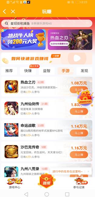 你也想在“玩赚”中玩游戏赚钱,那就快快先免费下载这款软件到手机上,任选两款游戏来试玩一两个小时。这款平台中玩游戏赚钱不仅奖励高,还是官方后台来自动发放用户任务重奖励的。