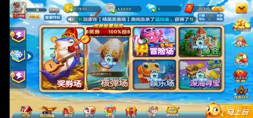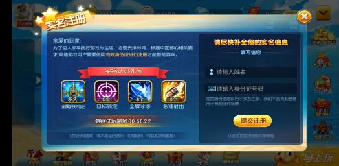 圣手捕鱼下载安装后微信就可以直接登录游戏,在平台提示中进行实名认证就送包含炮台和道具的实名大礼包。新人试玩奖券场和冒险场,进入游戏四个玩家对战,我们的发炮数达到要求就可以抽奖券,普通抽奖、小康抽奖、土豪抽奖都是可以抽到最高0.3元、3元、18元的红包奖励。