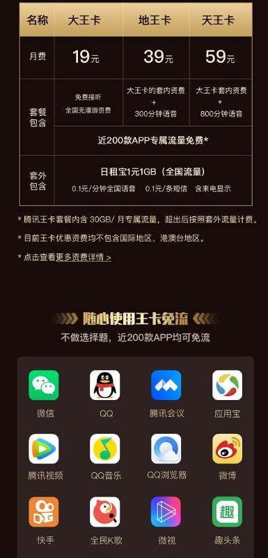 大王卡是腾讯推出的一款流量卡,当大家办理大王卡后,手机上的流量就不用愁了,因为大王卡本身可以领取30G的流量,同时因为是出自腾讯,所以手机上所以跟腾讯相关的应用软件都不需要流量,免流随便玩。