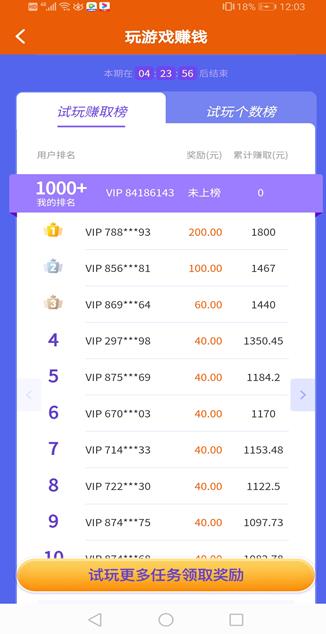 在平台中玩游戏的试玩奖励加上竞技奖励就有一百多块钱了。你以为这样就算赚到很多了,其实还可以更多。在平台中还有各项任务和活动都能赚奖励的,最新也最赚钱的活动就是“牛人榜单”了。每期为一周的牛人榜单排名试玩赚取榜和试玩个数榜的前100名就有额外现金奖励,其实只要你玩游戏稍稍用点心花点时间你就能进入任何一个榜单的,这份奖励都是白拿的。