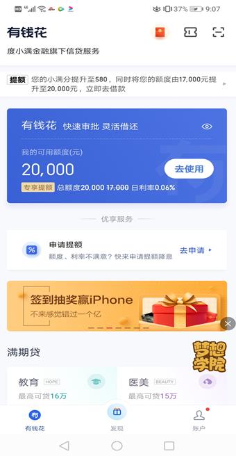 我朋友说他已经用有钱花借款三四年了,算是最早的一批在有钱花的借款用户了,他的借款额度是很高的,而且他的借款日利率也很低才0.3%。要知道有钱花中的很多用户,刚开始的借款日利率都是0.6%,而信誉良好、小满分高的用户最低的借款日利率能低至0.2%的。