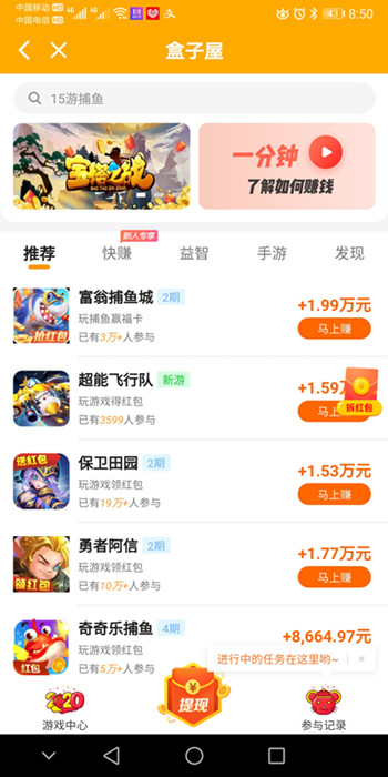 有些人可能还不清楚游戏试玩赚钱具体是怎么赚到钱,小编简单的介绍一下赚钱流程:首先是打开盒子屋,在游戏大厅中你可以看见有各种类型的游戏,数量非常多,每款游戏都有自己的奖金池,意思是完成一款游戏的所有任务就能够赚到这些钱,单款游戏的总奖金非常多,达到上万块钱,当然想要全部赚到手难度还是非常大的。