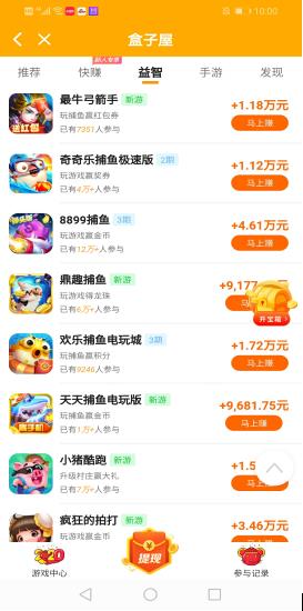 游戏中心中的游戏分为快赚、益智和手游,玩游戏赚钱一般都是在玩游戏的同时完成游戏任务,在平台中领取到任务奖励。在快赚中可以练习如何在盒子屋中玩游戏做任务,快赚中的游戏任务都是0.45元,基本上就是下载注册游戏进入游戏简单试玩游戏。