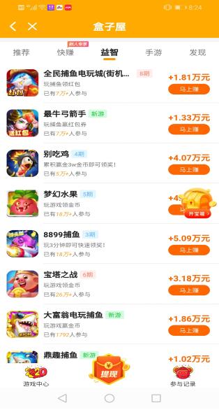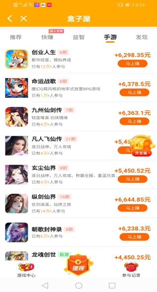 在盒子屋中玩游戏,每天我们可以任意切换玩游戏的时间,累计玩上一两个小时完全可以赚到几十块钱。越玩赚的也越多!